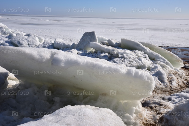 Подтаивающий лед и вид на Финский залив в конце весны на пляже Зеленогорска