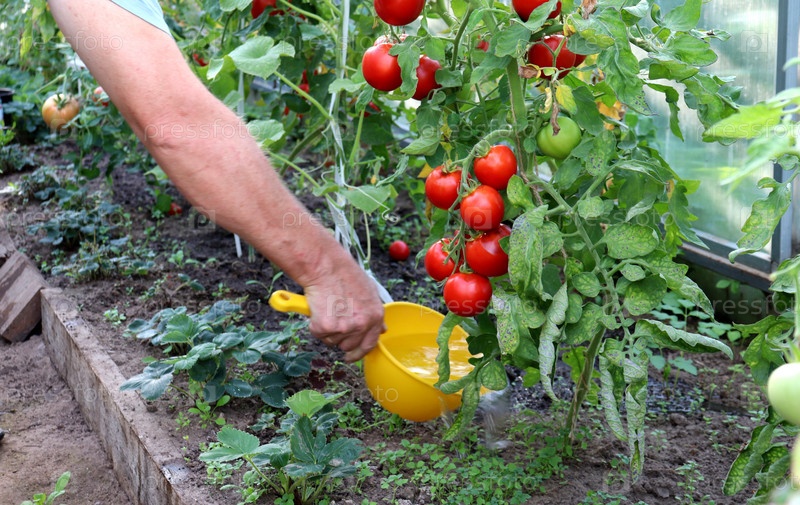 Мужчина поливает кусты томатов из ковша в теплице - рука, крупный план
