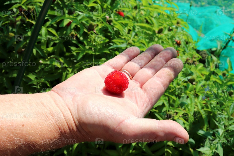 Спелая красная ягода тибетской малина на мужской ладони