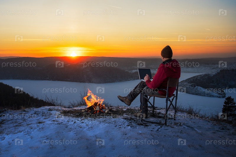 Ма использует ноутбук в походе на зимней природе