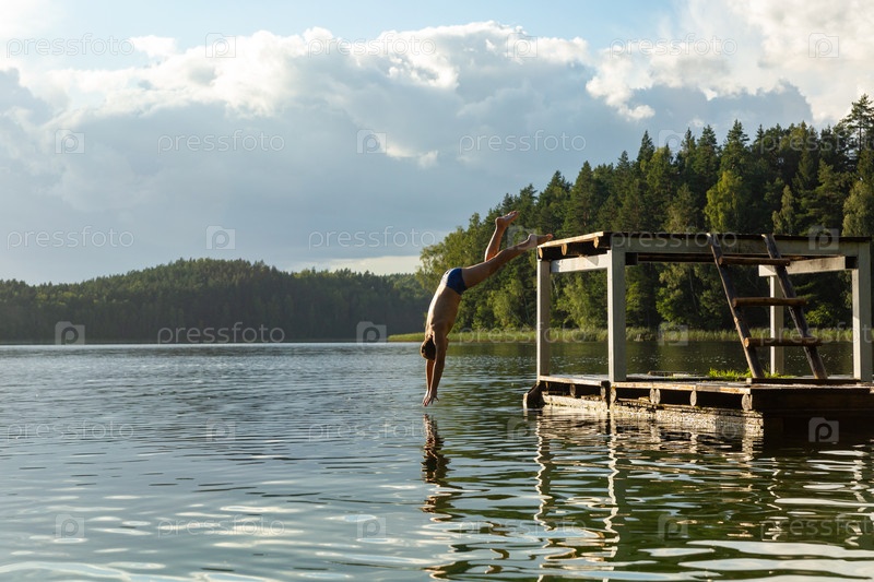 Дети прыгают в воду озера во время летних каникул