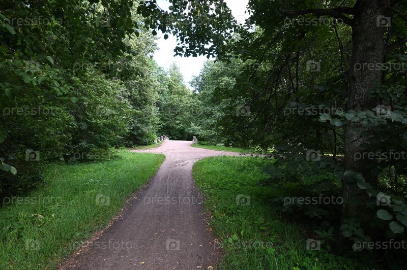 Аллея с перекрестком к мостику на бывшей усадьбе Лейхтенбергских в парке Сергиевка в пригороде Петергофа