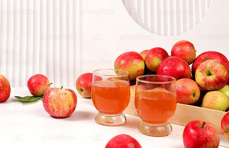 Яблочный сидр, сок или ферментированный напиток и свежие яблоки на солнечном столе. Осенний баннер. Диета и концепция потери веса. Здоровое питание, детоксикация организма, яблоки помогают очистить организм и снизить вес