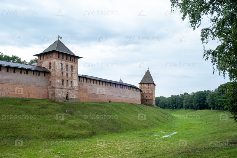 Новгород, Россия - 29, 24 июля. Вид на крепостную стену Новгородского кремля