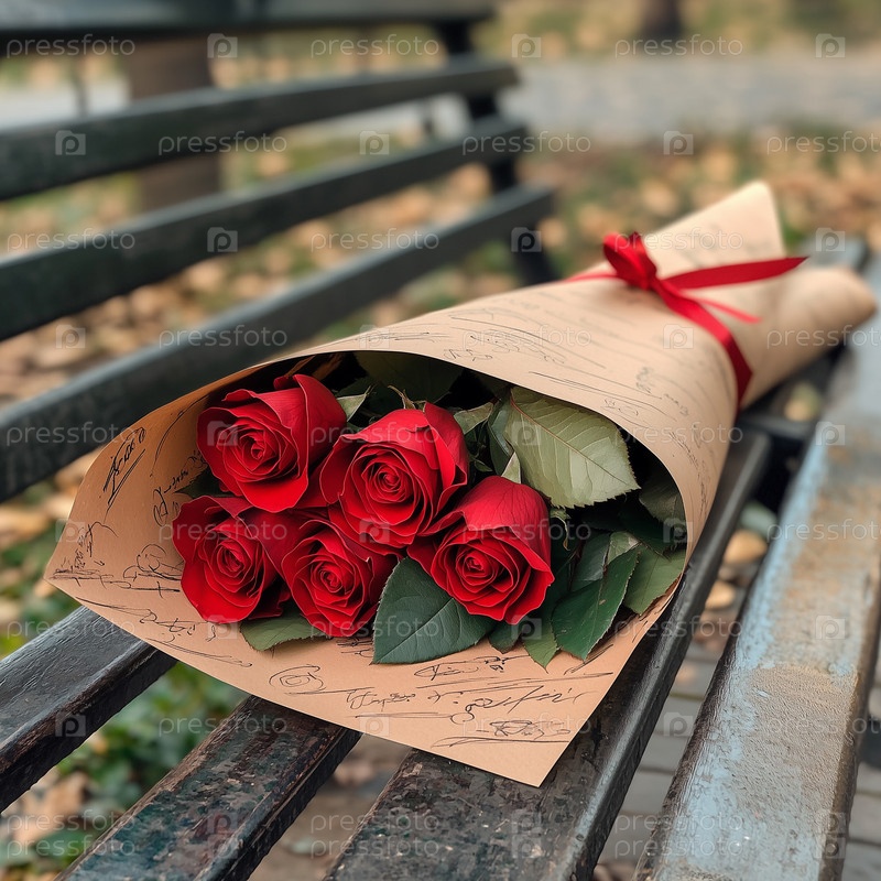 Букет красных роз в крафтовой бумаге лежит на скамейке в парке