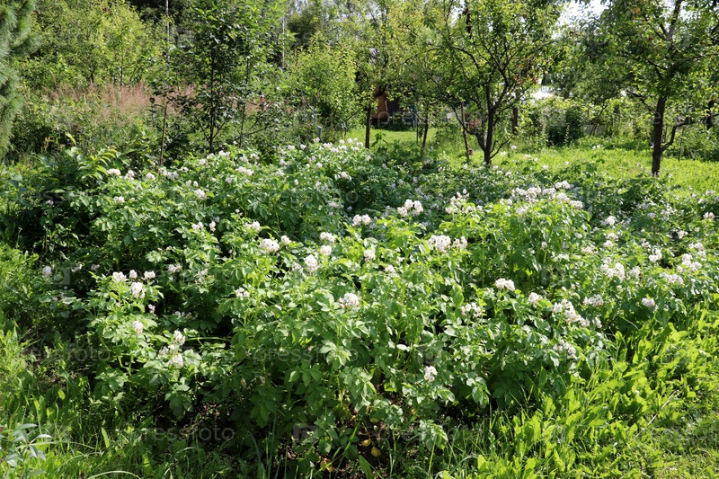 Поле цветущего картофеля - грядки на фоне фруктового сада
