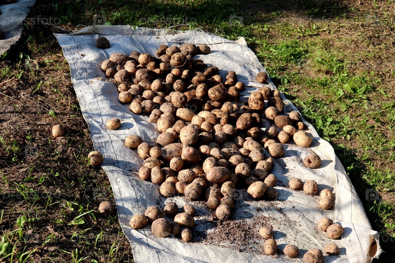 Выкопанный молодой картофель лежит на белом мешке на земле в огороде