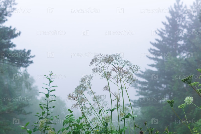 Фон с альпийской луговой растительностью на склоне горы внутри облака