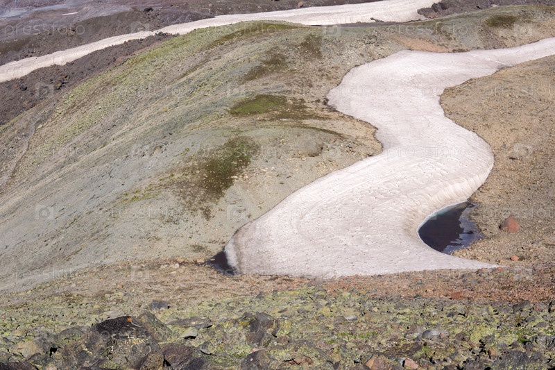 Горный пейзаж, скалистое ложе тающего ледника с замерзшим талым озером