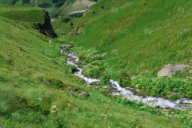 Быстрый ручей в каменистом русле среди альпийских лугов