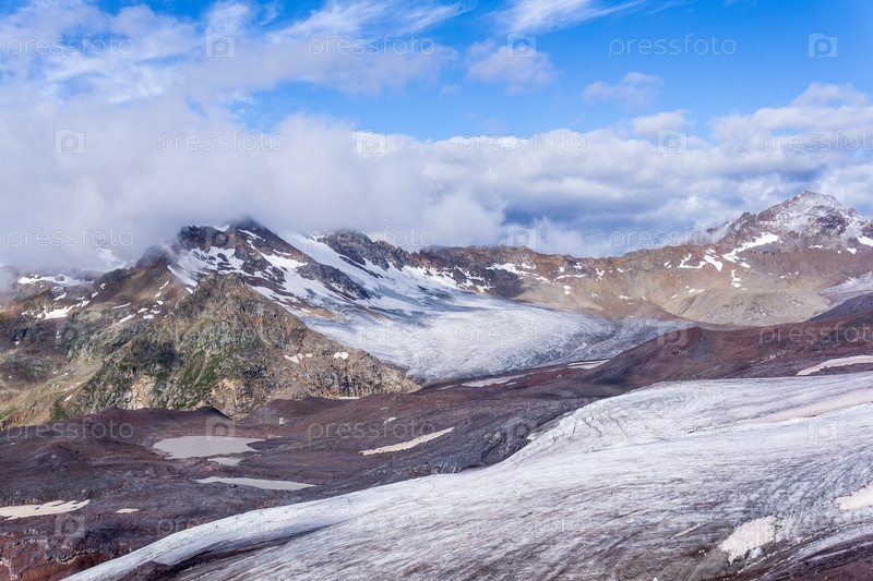 Панорамный высокогорный ландшафт Кавказа, вершины и ледники среди облаков