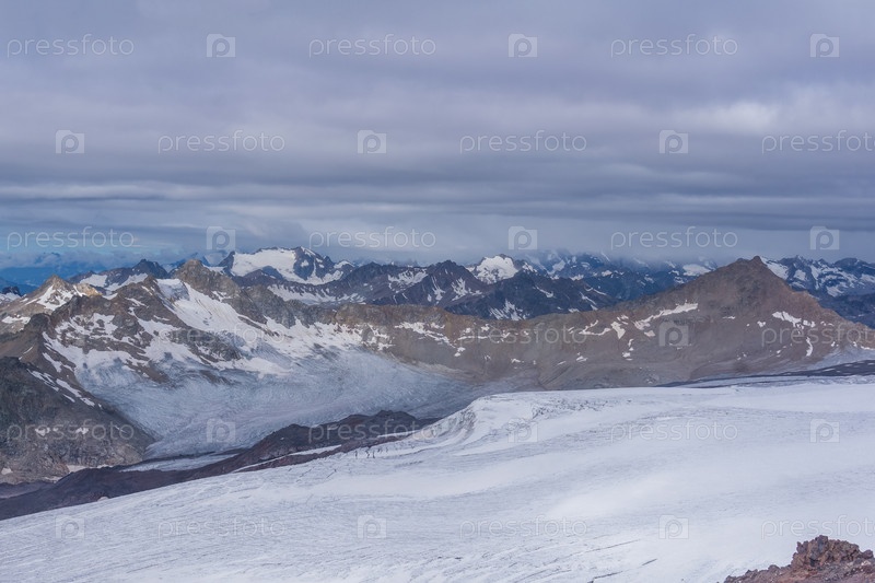 Вид на высокие горы над облаками с ледника на склоне Эльбруса