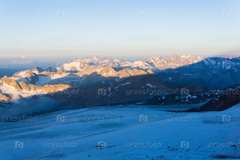 Горные вершины в утреннем свете рассвета, панорамный природный ландшафт