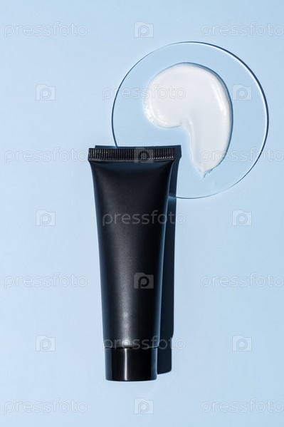 Черный пластиковый тюбик крема для лица или рук и образец текстуры в чашке Петри на синем фоне. Косметические лабораторные исследования
