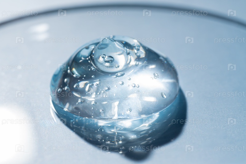Капля или мазок косметики. Капля жидкого прозрачного геля с пузырьками на синем фоне на чашке Петри