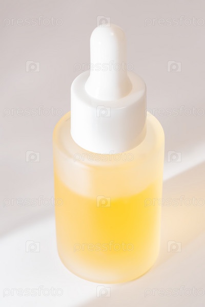 Вид сверху на флакон-капельницу из матового стекла с косметическим маслом для лица на мраморном фоне с драматическим светом. Антивозрастная сыворотка с ретинолом и активными ингредиентами