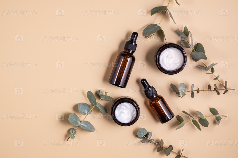 Коричневые стеклянные бутылки и ветки эвкалипта на бежевом фоне. Экологически чистая органическая натуральная косметика для ухода за кожей и телом. Копировать пространство