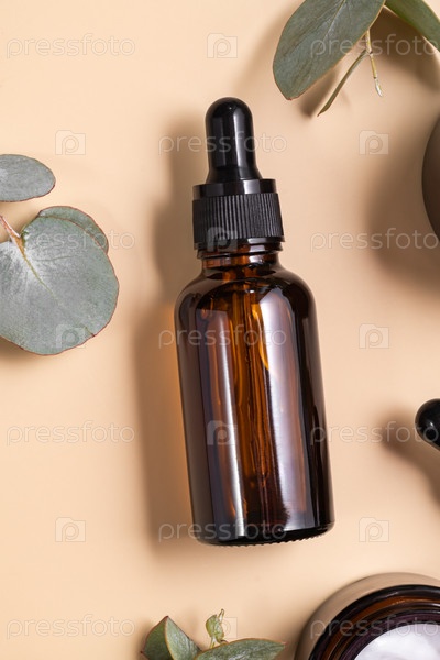 Пустой флакон из янтарного стекла с пипеткой на бежевом фоне, украшенный листьями эвкалипта. Концепция ухода за кожей с натуральной косметикой