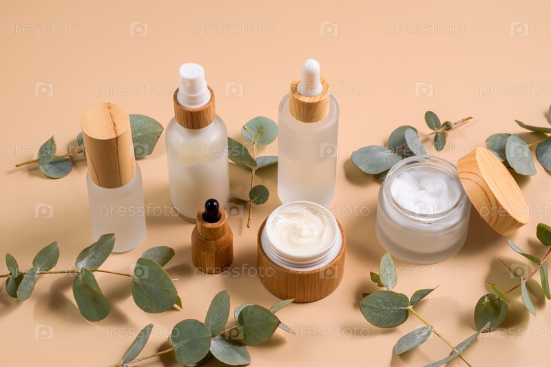 Антивозрастная коллагеновая сыворотка для лица в стеклянной бутылке и лицевой крем на бежевом фоне с ветвями эвкалипта. натуральная органическая косметика Beauty Concept