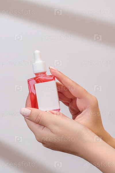 Женские руки держат бутылочку с сывороткой для ухода за лицом. Ежедневная рутина и лечение кожи. Макет для вашего дизайна