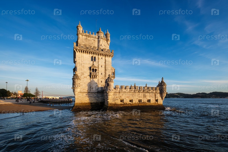 Башня Белен или башня Святого Винсента - известная туристическая достопримечательность Лиссабона и туристический аттракцион - на берегу реки Тежу Тежу на закате. Лиссабон, Португалия