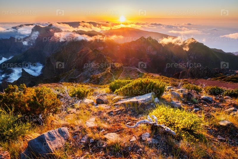 Вид на горы над облаками с Пику-Руйву на закате. Остров Мадейра, Португалия