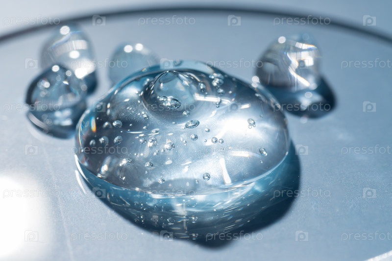 Капля гелевой косметической сыворотки на чашке Петри на синем фоне. Лабораторные исследования и косметические испытания. Концепция ухода за кожей