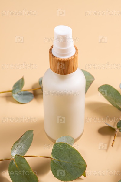 Крем для лица или тела в бутылочке из белого матового стекла с помпой, бамбуковой крышкой и натуральными экстрактами и маслами эвкалипта. Косметика для ухода за кожей. Лечение травами