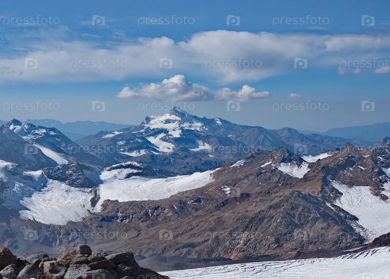 Россия. Кабардино-Балкария. Головокружительный вид на горные пики Кавказа вокруг горы Эльбрус (5642 м) - самой высокой горы России и Европы