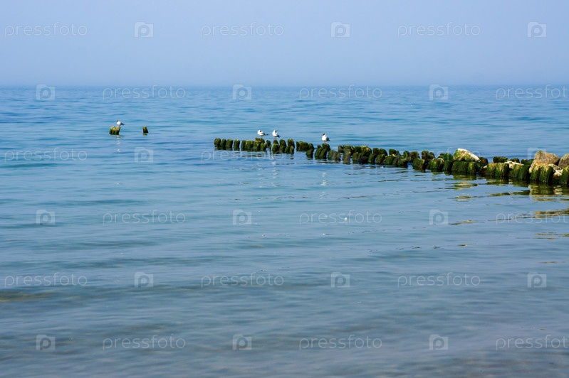 Волнорез в море. Чайки на волнорезе в океане. Береговая оборона в открытом море