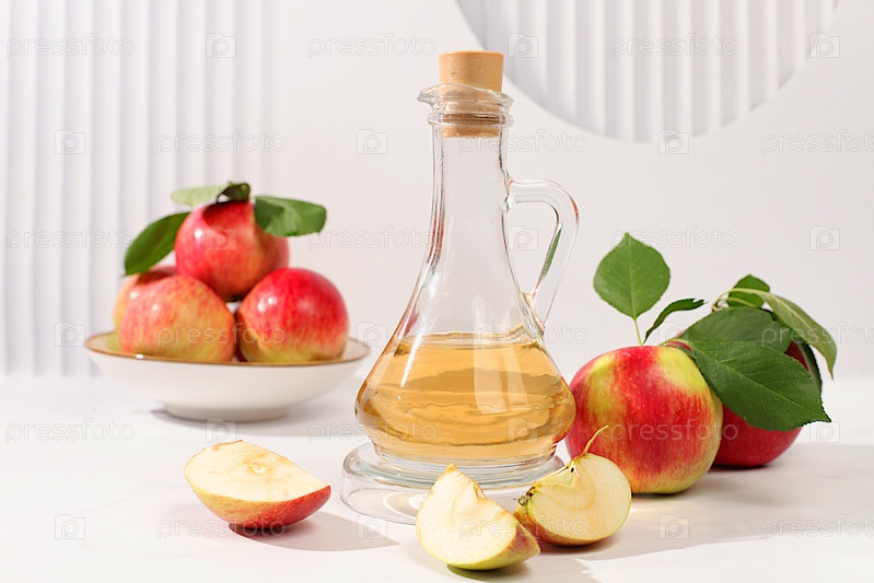 Яблочный уксус или ферментированный напиток и свежие яблоки на солнечном столе. Осенний баннер. Диета и концепция потери веса. Здоровое питание, детоксикация организма, яблоки помогают очистить организм