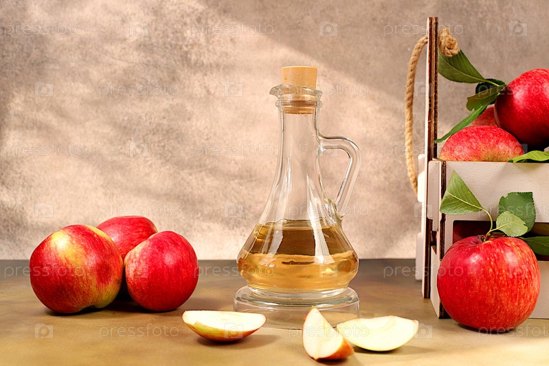 Яблочный уксус или ферментированный напиток и свежие яблоки на солнечном столе. Осенний баннер. Диета и концепция потери веса. Здоровое питание, детоксикация организма, яблоки помогают очистить организм