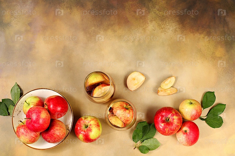 Яблочный сидр с кусочками яблок, корицей, бадьяном или ферментированным напитком и свежими яблоками. Осенний баннер. Диета и концепция потери веса. Здоровое питание, детоксикация организма, яблоки помогают очистить организм