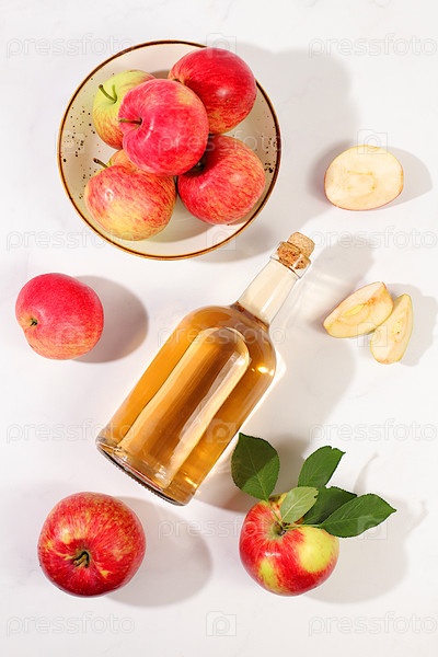 Яблочный сидр, сок, уксус или ферментированный напиток и свежие яблоки на солнечном столе. Осенний баннер. Диета и концепция потери веса. Здоровое питание, детоксикация организма, яблоки помогают очистить организм