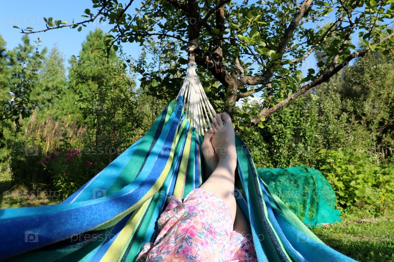 Женские перекрещенные ноги в гамаке в саду летом