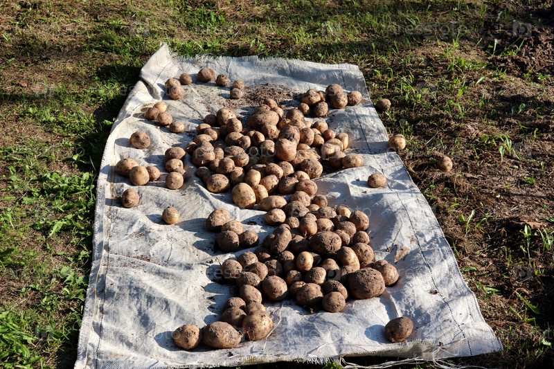 Свежий выкопанный картофель на белом мешке на земле в огороде летом