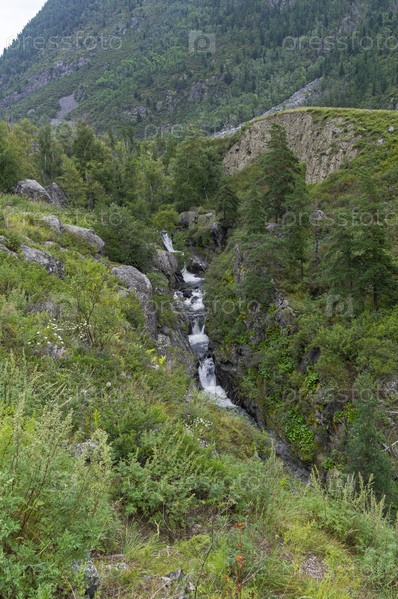 Каскад из небольших водопадов на горном ручье - притоке реки Чульча. Горный Алтай, Россия