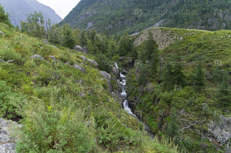 Каскад из небольших водопадов на горном ручье - притоке реки Чульча. Горный Алтай, Россия