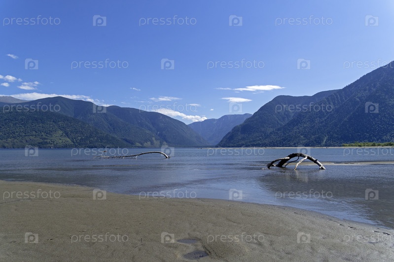 Коряга на отмели. Телецкое озеро, Горный Алтай. Солнечный день в августе