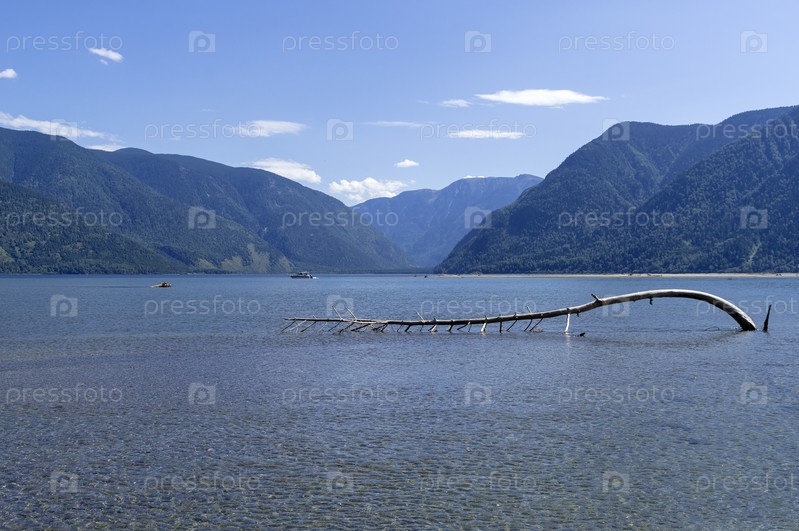 Коряга на отмели. Телецкое озеро, Горный Алтай. Солнечный день в августе