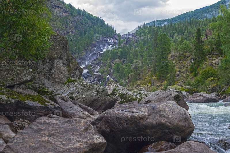 Река Чульча, на заднем плане - водопад Учар. Горный Алтай, пасмурный день в августе