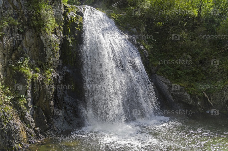 Водопад Корбу. Водопад расположен недалеко от впадения реки Корбу в Телецкое озеро и активно посещается туристами. Алтай, солнечный день в августе