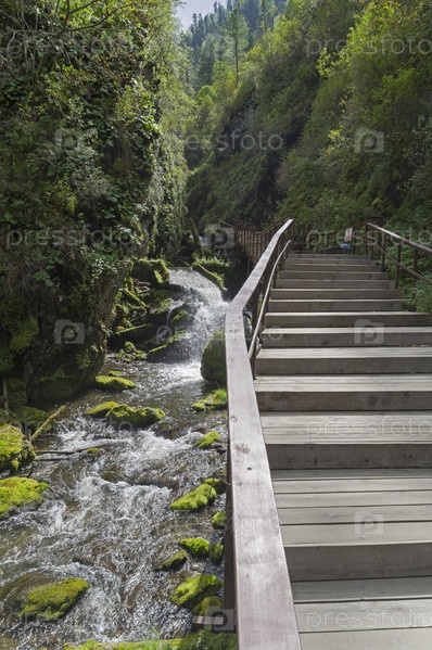 Благоустроенная пешеходная дорожка, ведущая к водопау Эстюбэ. Водопад расположен недалеко от впадения реки Большой Эстюбе в Телецкое озеро и активно посещается туристами. Алтай, солнечный день в августе