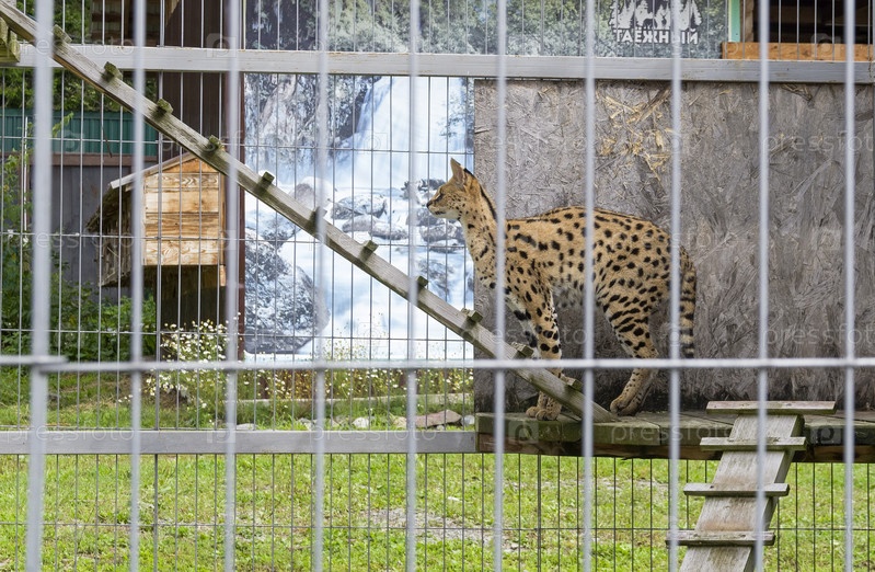 Сервал в зоопарке. "Таежный зоопаррк" в селе Артыбаш на берегу Телецкого озера, Россия. Август