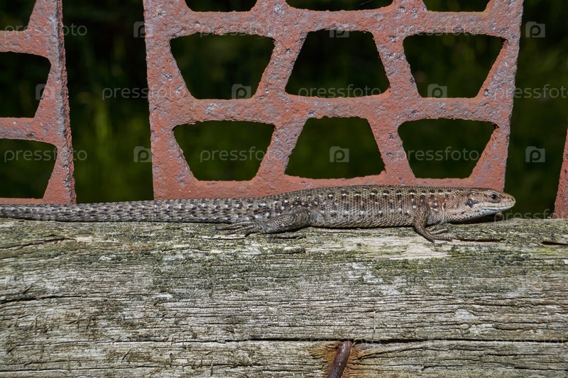 Притча или обыкновенная ящерица греется в саду на доске старого забора. вид ящериц из семейства настоящих