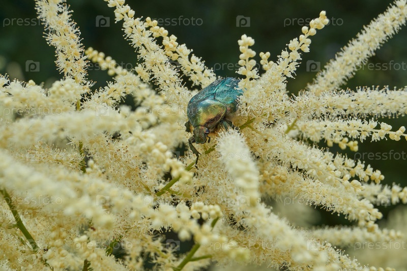 Золотая бронзовка (лат. Cetonia aurata) ползает по цветущим растениям в саду