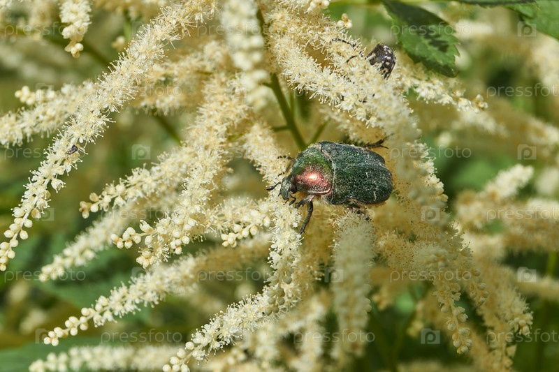 Золотая бронзовка (лат. Cetonia aurata) ползает по цветущим растениям в саду