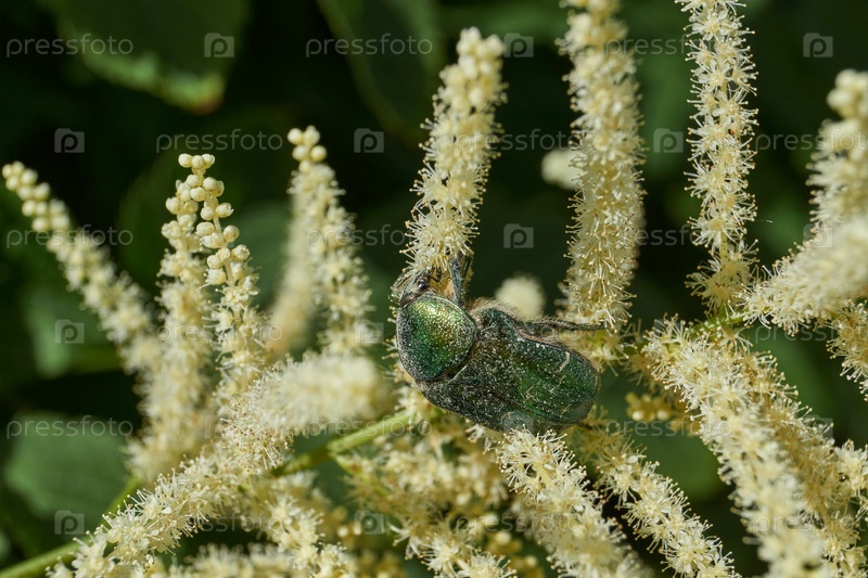 Золотая бронзовка (лат. Cetonia aurata) ползает по цветущим растениям в саду