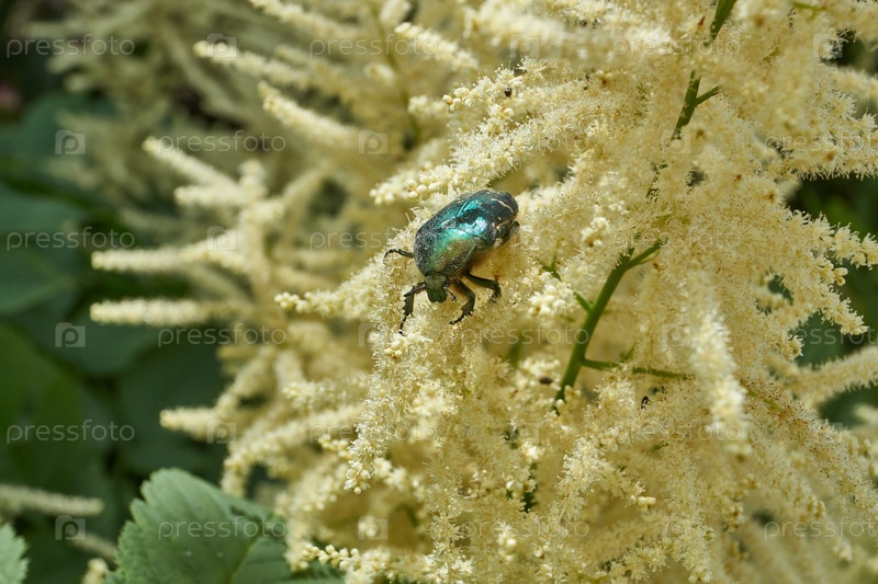 Золотая бронзовка (лат. Cetonia aurata) ползает по цветущим растениям в саду