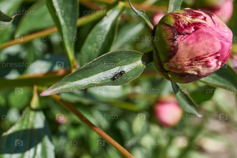 Бутон пиона готовится распуститься в саду. Лето